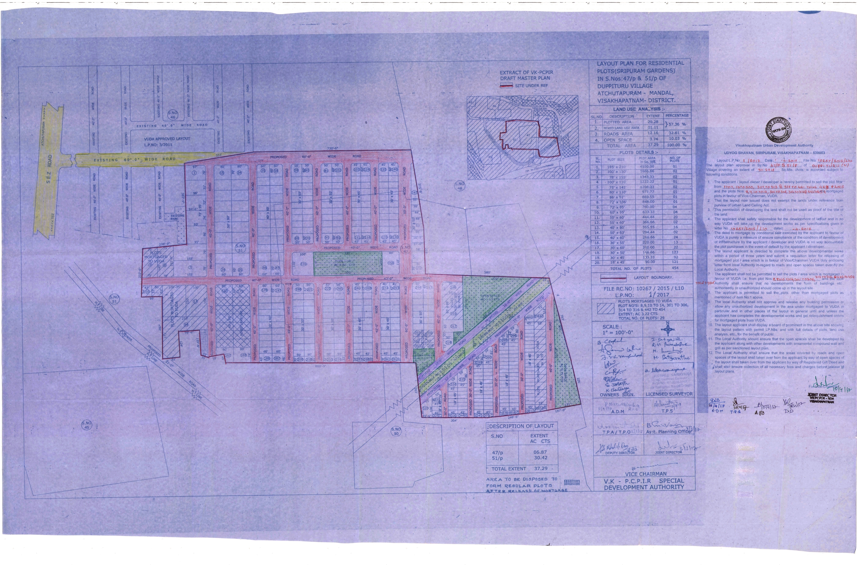 | 52 | 10267/2015/L10 | 1/2017 | | VK-PCPIR SDA, Visakhapatnam - Approval of Layout for an extent of AC.37.29 Cts in S.Nos.47/p & 51/p of Dupputuru Village, Atchutapuram Mandal, Visakhapatnam District vide L.P.No.1/2017 in favour of Sri B.Gopala Krishna and others, Visakhapatnam - Orders - Issued. | Dupputuru Village, Atchutapuram Mandal, Visakhapatnam District | 425 | 37.29 | 47/p & 51/p | 10/04/2017 | PRVT | VIEW | VIEW |